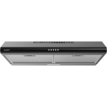 Comfee’ 30 Inch Under Cabinet Range Hood is a compact, stylish solution for smaller kitchens or light daily cooking. It features a three-speed exhaust fan with a surprisingly quiet operation and an easy-to-use push-button control panel. Its slim body makes it an ideal fit under most kitchen cabinets, and it supports both ducted and ductless installation. With reusable 5-layer aluminum filters and two LED lights, this hood balances simplicity and practicality. Its durable black stainless steel design adds a modern touch while keeping maintenance low with easy wipe-down cleaning and dishwasher-safe filters.