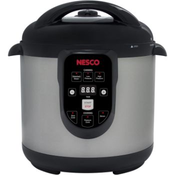 NESCO NPC-9 Smart Electric Pressure Cooker and Canner is a versatile kitchen appliance designed to make home food preservation and everyday cooking easier and safer. With its spacious 9.5-quart capacity and smart digital controls, this appliance allows you to pressure can, water bath can, pressure cook, steam, and slow cook in one compact unit. The programmable display and preset functions help simplify the canning process while maintaining consistent pressure and temperature. Its durable stainless steel exterior, removable non-stick cooking chamber, and built-in safety features make it a practical choice for beginners and experienced home canners who want reliable performance and convenient operation.