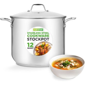 When you’re prepping for hearty winter meals, large batches of soups, stews, or boiled pasta, the NutriChef 12-Quart Stainless Steel Stockpot delivers exactly what your kitchen needs. Crafted from food-grade 18/8 stainless steel with a thick base for even heating, this pot is designed for both serious home cooks and holiday hosts who want reliable performance and long-lasting durability. Its mirror-polished finish adds a professional touch to your cookware collection, while the see-through tempered glass lid makes it easy to keep an eye on your meal.