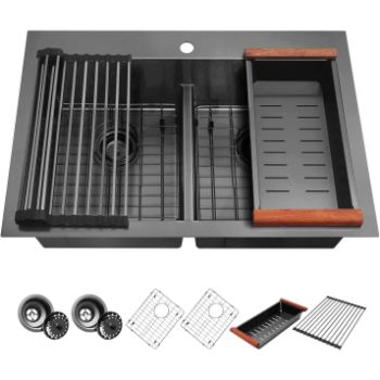 Upgrade your kitchen with the YITAHOME 33 Inch Black Stainless Steel Drop-In Kitchen Sink, a sleek and durable choice designed for style and function. Coated with a nano gunmetal black finish, this single-bowl sink offers scratch resistance, a modern matte look, and effortless maintenance. With a spacious 10-inch depth and smart sloped drainage, it makes washing large pots and pans easy. It’s built with a sturdy 3mm stainless steel edge and sound-absorbing pads to keep things quiet while you work. Whether you’re doing a full meal prep or just rinsing veggies, this sink handles it all, and looks great doing it.
