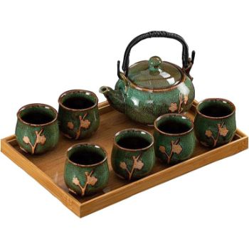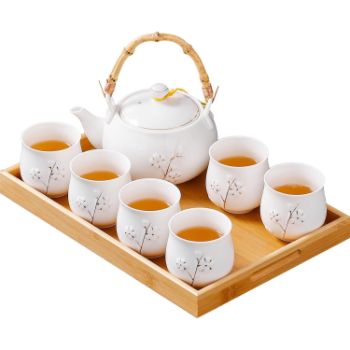 - Complete porcelain tea set japanese style with 1 teapot, 6 cups, and bamboo tray
