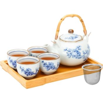 - Complete porcelain tea set japanese style with 1 teapot, 4 cups, and bamboo tray